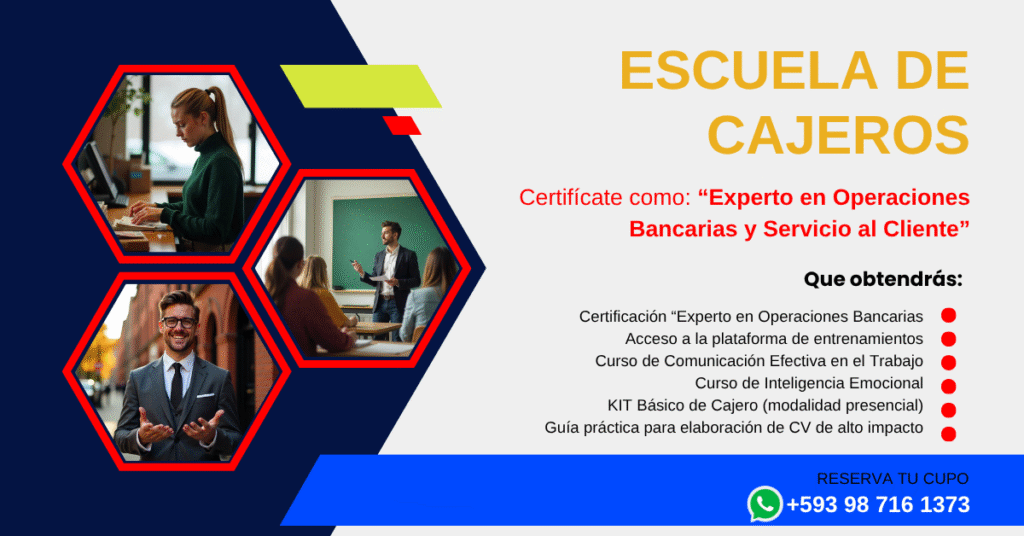 En nuestra Escuela de Cajeros te certificamos como «Experto en Operaciones Bancarias y Servicio al Cliente», te preparamos con las mejores herramientas para destacar en el mundo financiero y comercial. Aprende técnicas prácticas, manejo de efectivo, prevención de fraudes y estrategias de servicio al cliente que te convertirán en un profesional altamente capacitado.